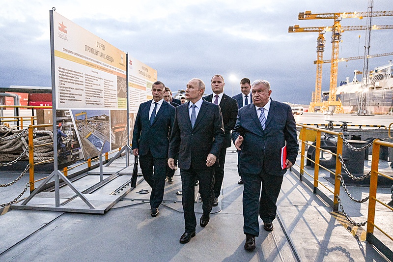 當地時間2023年9月11日,俄羅斯濱海邊疆區,俄羅斯總統普京出席北極液化天然氣油輪“Aleksey Kosygin”和穿梭油船“Valentin Pikul”號的命名儀式。 視覺中國