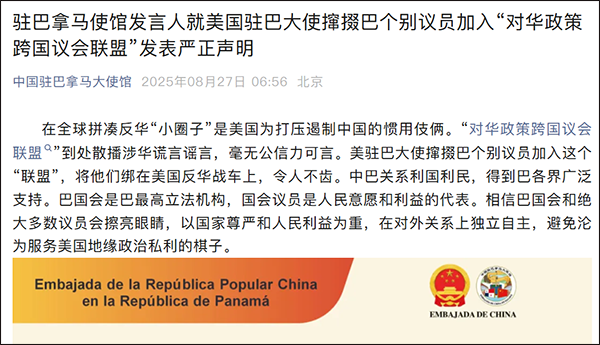 微信公眾號“中國駐巴拿馬大使館”8月27日消息,駐巴拿馬使館發言人就美國駐巴大使攛掇巴個別議員加入“對華政策跨國議會聯盟”發表嚴正聲明。