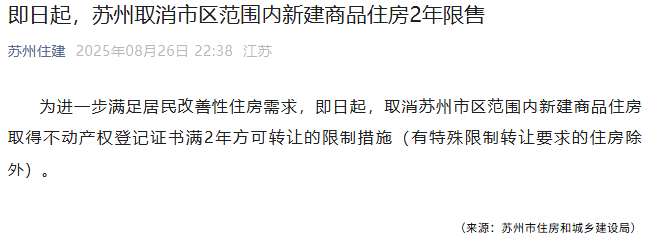 為進一步滿足居民改善性住房需求,即日起,取消蘇州市區範圍內新建商品住房取得不動產權登記證書滿2年方可轉讓的限制措施(有特殊限制轉讓要求的住房除外)。