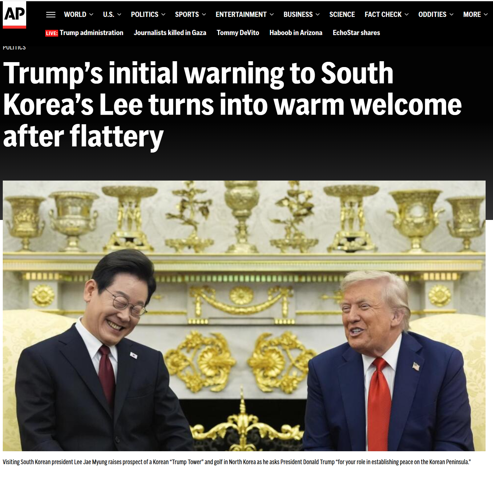 好在見面後,李在明先是恭維特朗普對白宮橢圓辦公室的重新裝修非常“美麗”,讚揚了特朗普在半島和平方面的持續努力和重要角色,還説應該在朝鮮修建一座特朗普塔。這也換來了特朗普的商業回吹:“我們彼此認識並且相處得很好,很榮幸能和你在一起,祝賀你當選。那是一件大事,我們100%支持你。”這也被韓國媒體解讀為特朗普支持李在明的當選和政策,使韓國右翼一直鼓吹的“選舉舞弊”大受打擊,令韓國國內極右翼勢力大為失望,而這可能也是李在明訪美的重要成果之一。