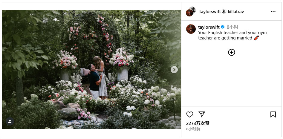 兩人當天在社交媒體平台聯合發帖稱:“你的英語老師和你的體育老師要結婚了”,並附上了一張凱爾西單膝跪地擁抱斯威夫特的照片。