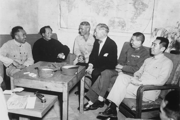 美駐華大使赫爾利偕同蔣介石代表張治中,為迎接毛澤東赴重慶乘專機離渝。離渝時,赫爾利發表聲明稱:“餘現將赴延安,曾獲得蔣主席同意與充分讚許。”“餘現赴延安,至感愉快,吾人曾不斷作一年以上之努力,以協助國民政府消除內爭之可能性。”到達延安時,毛澤東、朱德、周恩來、林伯渠等至機場歡迎。