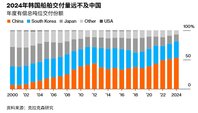 韓國是僅次於中國的全球第二大造船國。據中國海洋裝備工程科技發展戰略研究院援引克拉克森(Clarksons)數據,2024年中韓日造船完工佔世界的比重分別為51.99%、26.78%和11.67%,新簽訂單佔世界的比重分別為70.11%、16.49%和4.92%。