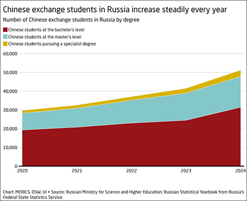 柏林智庫墨卡託中國研究中心數據顯示,多年來,在俄羅斯的中國學生數量穩步增長,從2020年的約3萬人增加到2024年的5萬人以上,增長了72%;同樣,中國學生佔比也越來越大,從2020年的9.4% 上升到2024年的 13.6%,成為僅次於哈薩克斯坦和土庫曼斯坦的第三大原籍國。