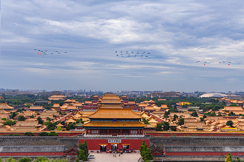 2025年8月24日,北京,紀念抗戰勝利80週年大會第三次綜合演練,戰機飛過上空。 視覺中國