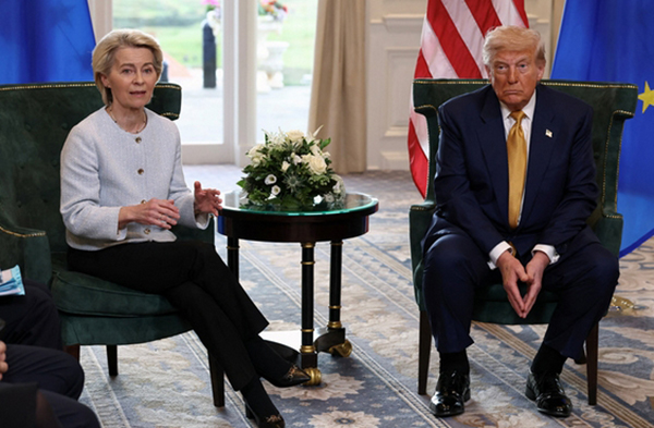 上月底,馮德萊恩與特朗普在蘇格蘭的一個高爾夫球場舉行了一個小時的會談後,雙方宣佈達成框架貿易協議,美國同意將此前公佈對大部分歐盟進口商品徵收的30%關税降至15%。