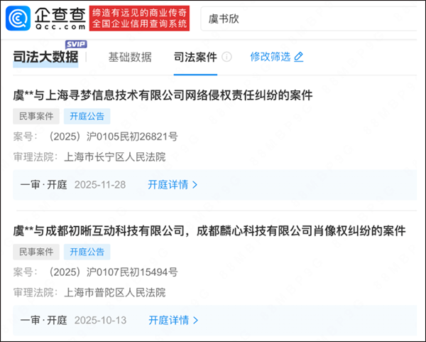 據企查查公開信息顯示,演員虞書欣名下兩起案件已在上海法院開庭審理,案由分別為“網絡侵權責任糾紛”和“肖像權糾紛”。其中,肖像權糾紛一案被告為《開間小店》遊戲相關公司,因被指未經授權在遊戲中使用與虞書欣高度相似的虛擬形象;另一宗“網絡侵權責任糾紛”案件的具體細節則尚未公開。