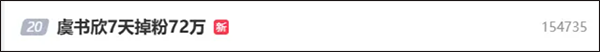 隨着訴訟信息和事件相關討論持續發酵,公眾關注度不斷上升。第三方數據顯示,虞書欣在社交平台近7日內粉絲淨減少超過72萬,這一“掉粉”現象迅速成為熱議話題,並登上各大熱搜榜單。粉絲流失被認為與多重爭議事件疊加相關,包括綜藝片段、網絡案件以及家庭財務問題。