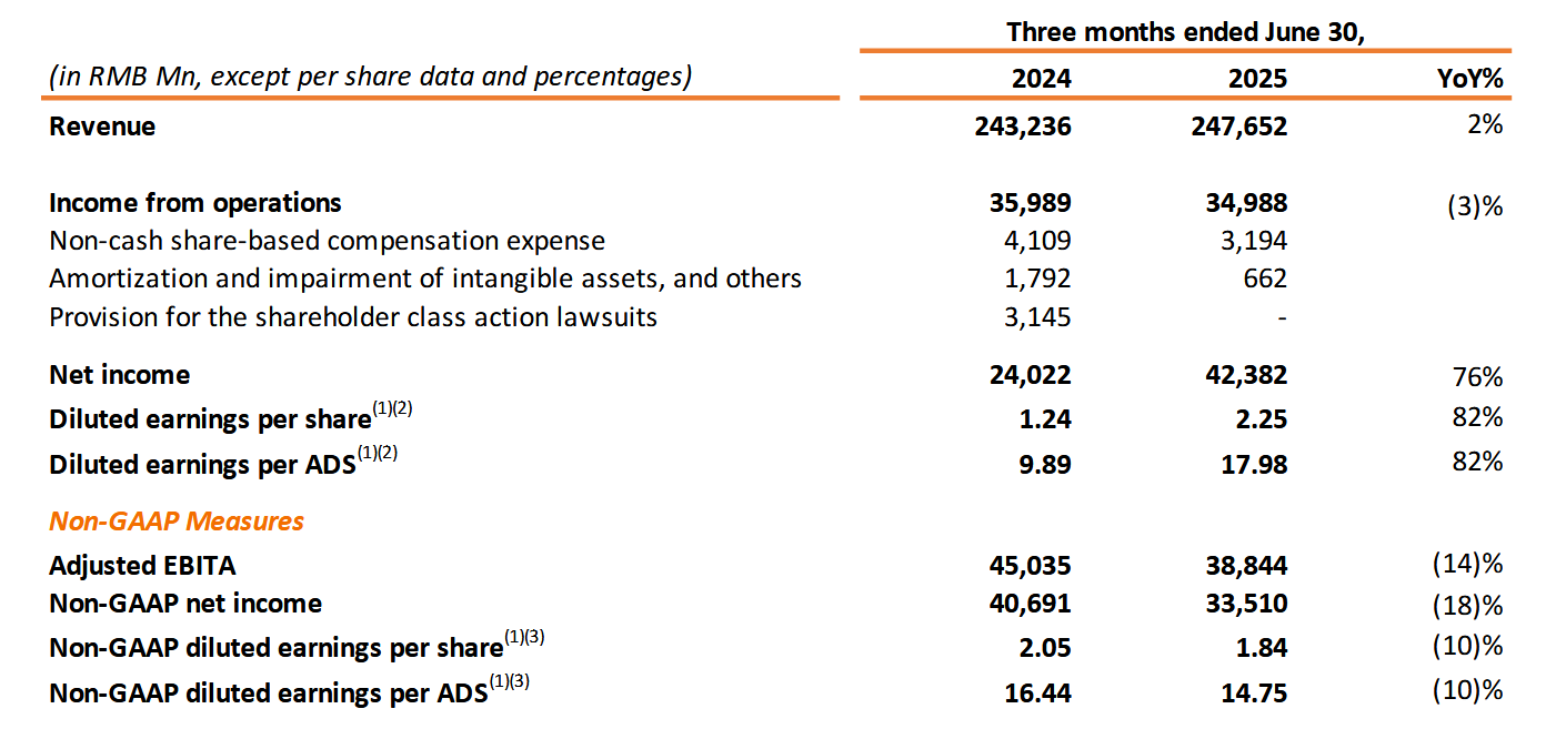 截至2025年6月30日止的季度收入為人民幣2476.52億元(345.71億美元),同比增長2%。若不考慮高鑫零售和銀泰的已處置業務的收入,同口徑收入同比增長將為10%。