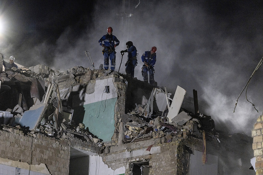 當地時間2025年8月28日,烏克蘭基輔,緊急救援人員在俄羅斯軍隊夜間轟炸後搜尋倖存者。視覺中國