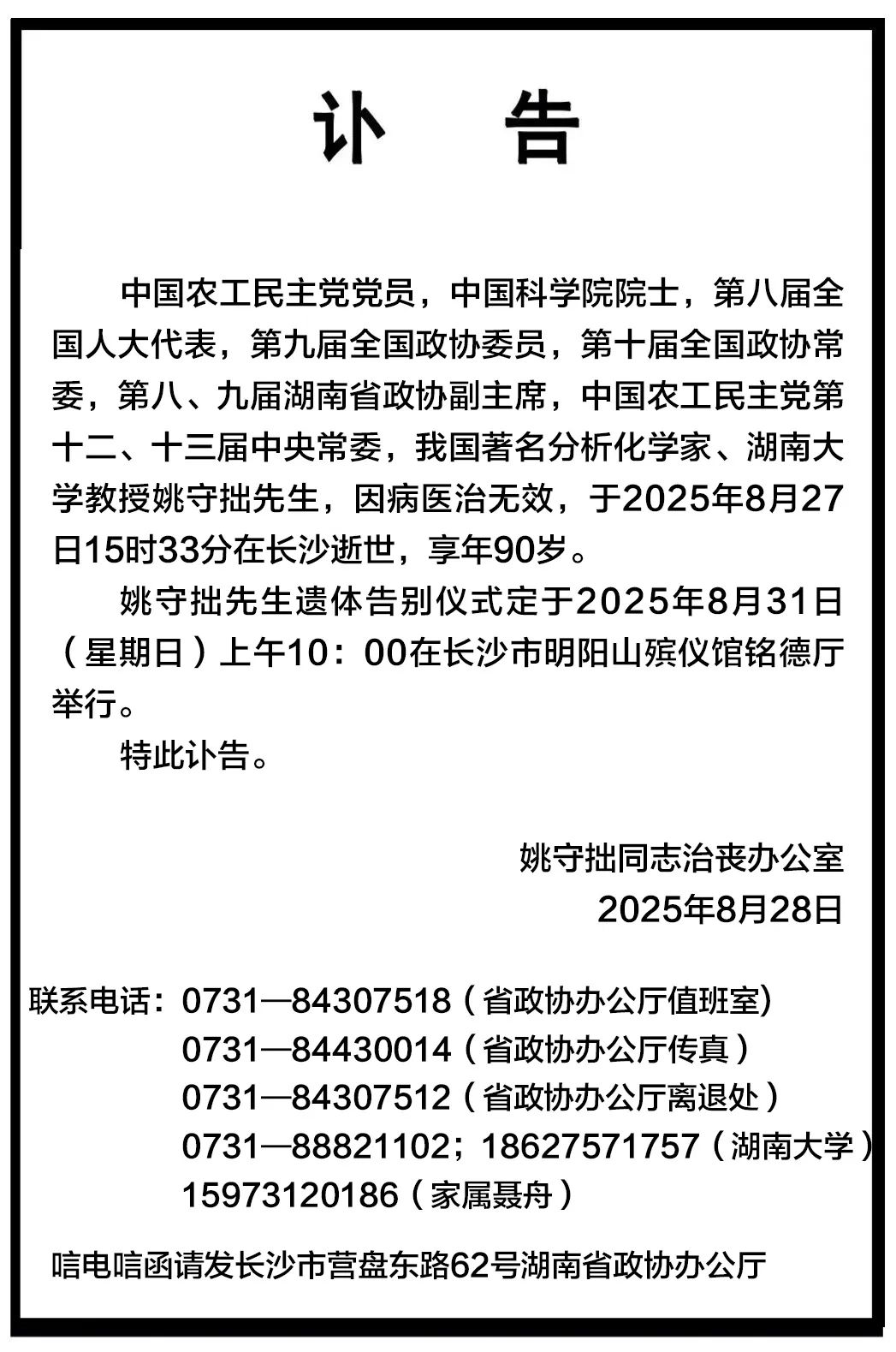 據湖南省政協微信公號“政協雲”28日晚消息,中國農工民主黨黨員,中國科學院院士,第八屆全國人大代表,第九屆全國政協委員,第十屆全國政協常委,第八、九屆湖南省政協副主席,中國農工民主黨第十二、十三屆中央常委,我國著名分析化學家、湖南大學教授姚守拙先生,因病醫治無效,於2025年8月27日在長沙逝世,享年90歲。