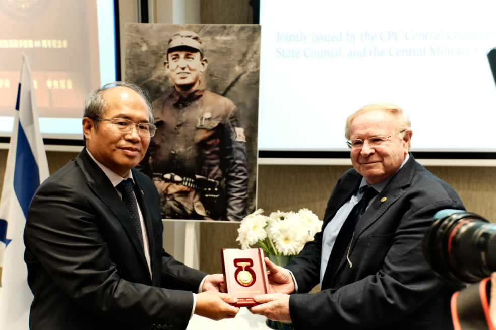 中國駐以色列大使肖軍正向猶太國際主義戰士羅生特的侄子轉交中方向羅生特頒發的“中國人民抗日戰爭勝利80週年”紀念章。微信公眾號“以館為家”