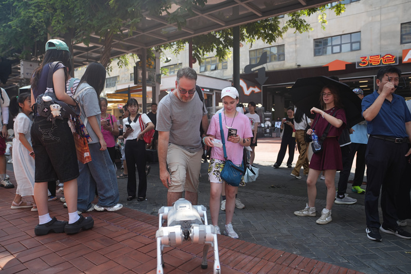 2025年7月30日,四川成都,外國遊客與四足機器人互動。 東方IC