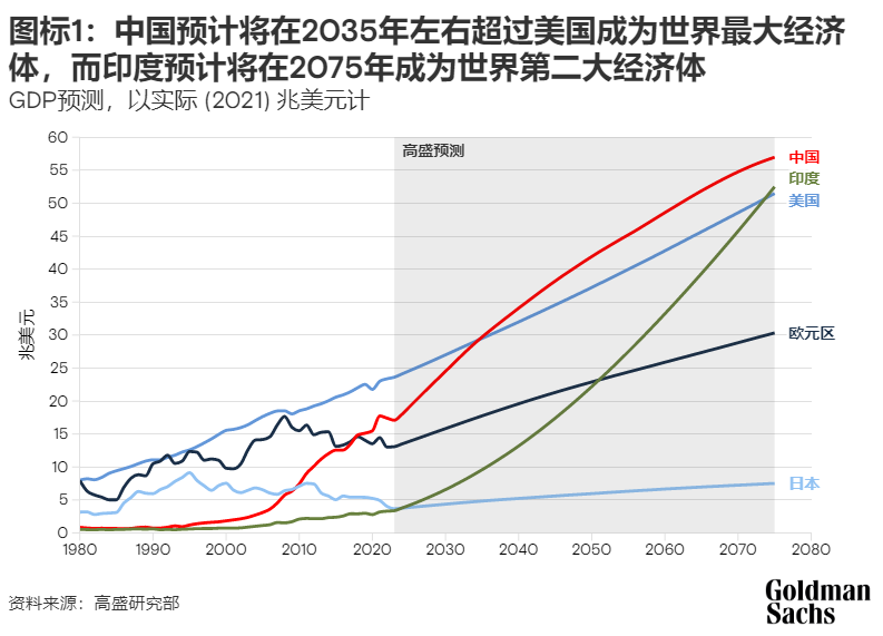 未來全球經濟裏,中美印會是經濟規模長期排前三的經濟體,而且與後面的國家拉開較大差距(歐元區由多國組成)。高盛等機構就發佈了十分看好印度的長期經濟預測。