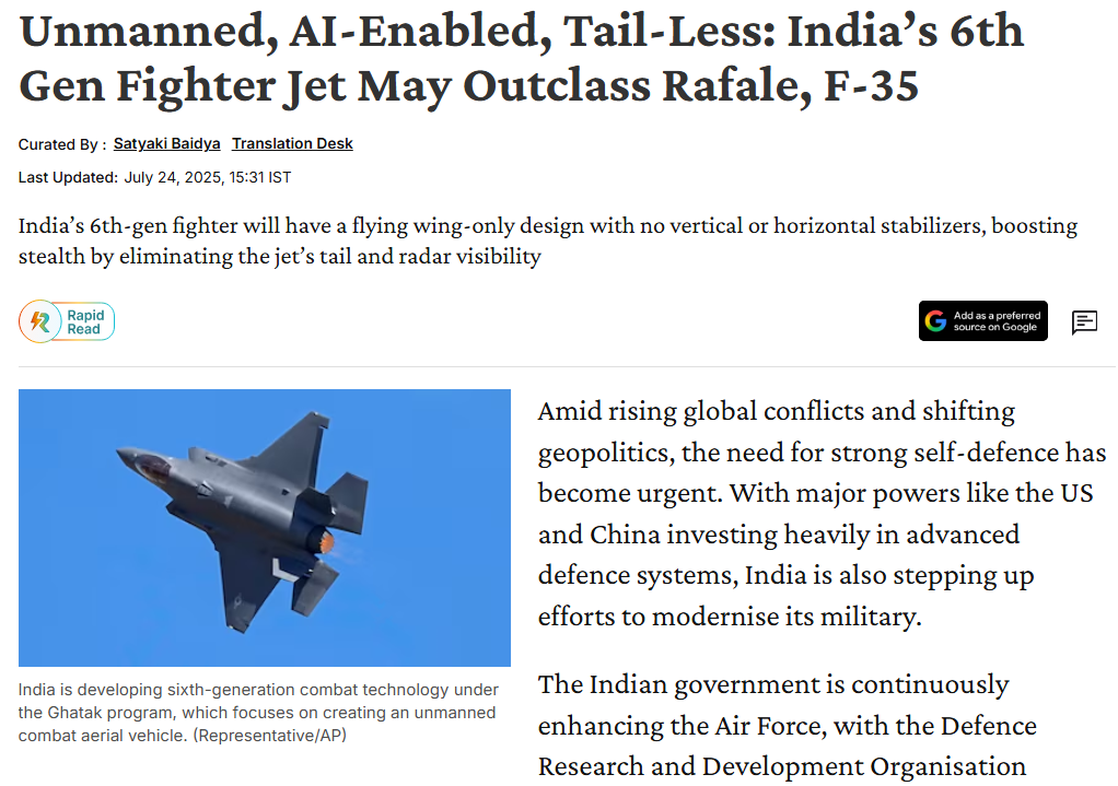 今年7月,印媒宣稱其“第六代戰鬥機”性能將超越法國“陣風”、美國F-35戰機