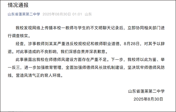 微信公眾號“山東省蓬萊第二中學”8月30日發佈情況通報稱,學校發現網絡上傳播本校一教師與學生的不文明聊天記錄後,立即協同相關部門進行調查核實。