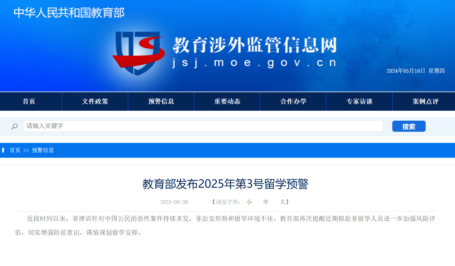 近段時間以來,菲律賓針對中國公民的惡性案件持續多發,菲治安形勢和留學環境不佳。教育部再次提醒近期擬赴菲留學人員進一步加強風險評估,切實增強防範意識,謹慎規劃留學安排。