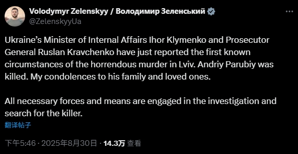 “烏克蘭內政部長伊霍爾·克萊緬科和總檢察長魯斯蘭·克拉夫琴科剛剛彙報了利沃夫可怕謀殺的初步情況,”澤連斯基在X平台發文稱,“安德烈·帕魯比遇害。我向他的家人和親人表示哀悼。”
