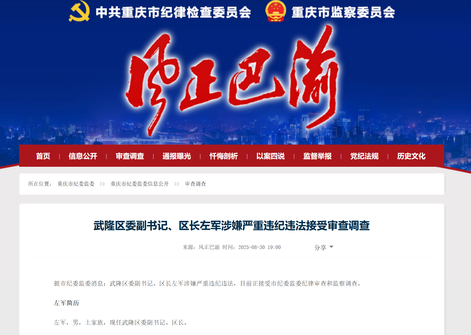 據重慶市紀委監委網站8月30日消息:武隆區委副書記、區長左軍涉嫌嚴重違紀違法,目前正接受市紀委監委紀律審查和監察調查。