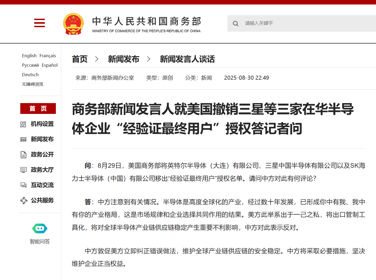 商務部網站消息,商務部新聞發言人就美國撤銷三星等三家在華半導體企業“經驗證最終用户”授權答記者問。