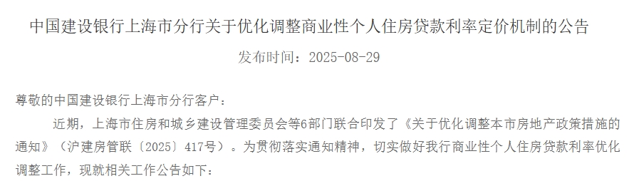 在8月25日,上海市6部門聯合印發《關於優化調整本市房地產政策措施的通知》後,銀行側的新政策也來了。