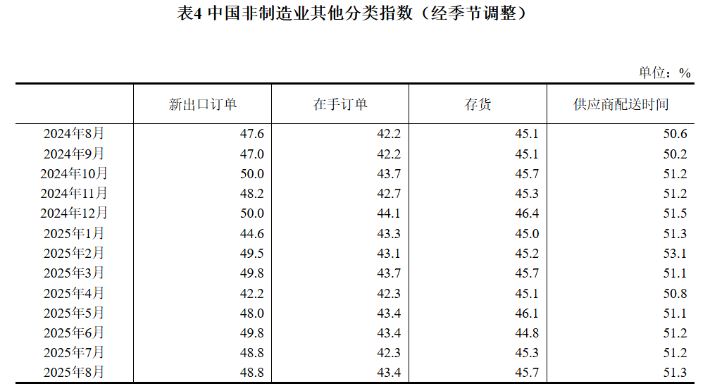 供應商配送時間指數為50.5%,比上月上升0.2個百分點,表明製造業原材料供應商交貨時間持續加快。