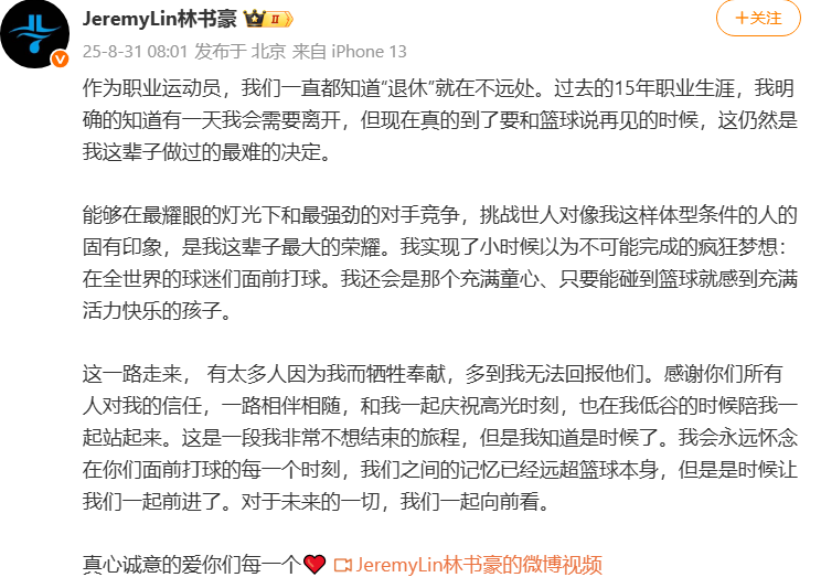 8月31日,籃球運動員林書豪在個人微博@JeremyLin林書豪 發文宣佈退役: