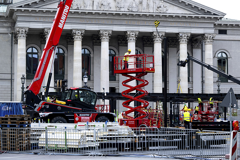 當地時間2025年8月29日,德國慕尼黑,工人們在馬克思-約瑟夫廣場為2025年慕尼黑車展搭建展台。 視覺中國