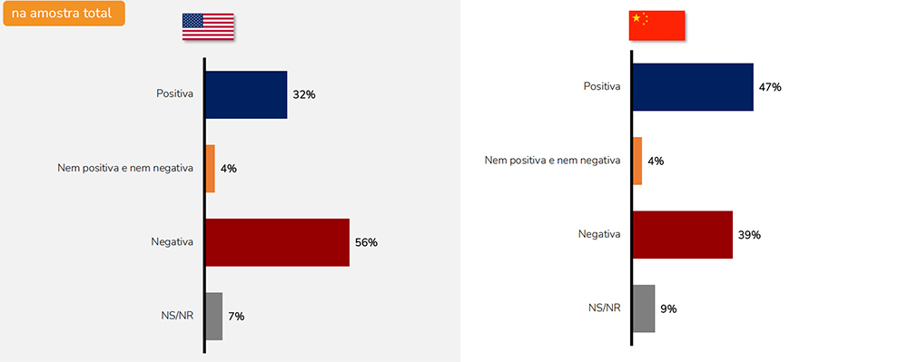 調查結果顯示,被問及中美兩國在全球政治經濟領域上的領導力對巴西的影響時,56%的巴西民眾對美國領導力持負面看法,僅32%的人持正面看法;而中國的領導力被47%的巴西民眾視為正面,39%視為負面。