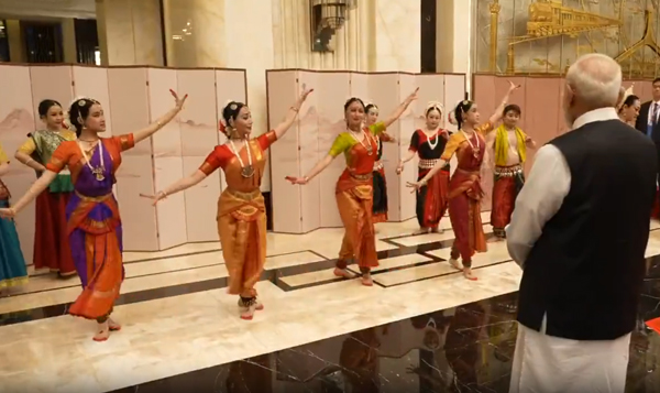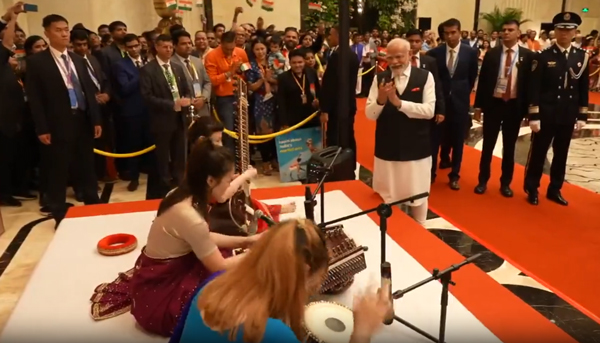 在酒店大堂,多名中國藝術家為莫迪表演印度傳統音樂和舞蹈,莫迪駐足欣賞並鼓掌感謝。