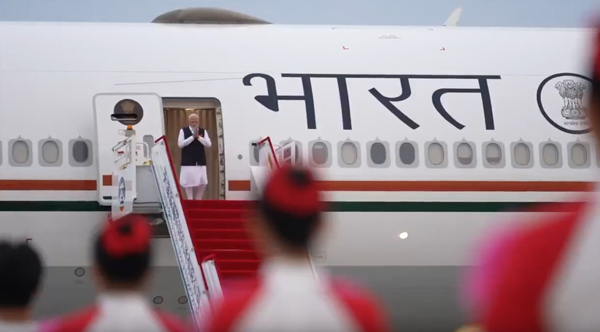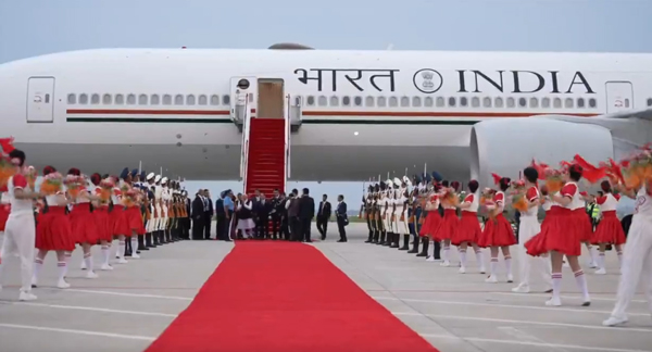 隨後是莫迪走出機艙,雙手合十向現場人員致意。視頻顯示,機場鋪就了紅毯,還有儀仗隊伍及舞蹈方陣歡迎莫迪的到來。
