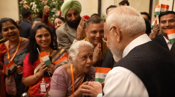 莫迪抵達下榻的酒店時,許多印度僑民在大堂等待,並向莫迪歡呼致意。隨後,莫迪走近人羣,和他們一一握手、問候。
