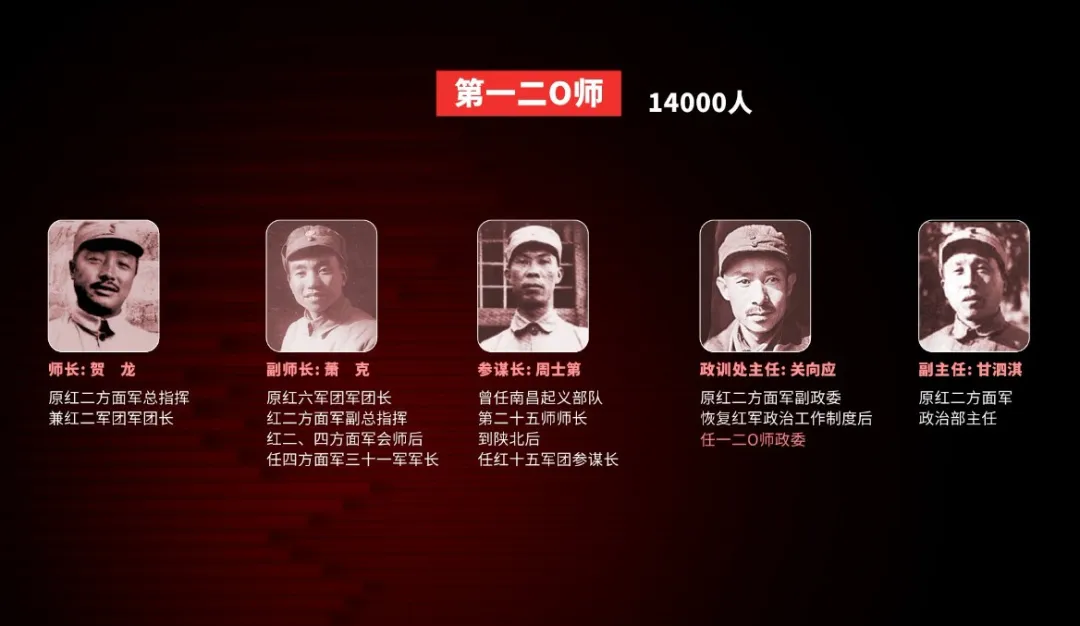 師長賀龍(原紅二方面軍總指揮兼紅二軍團軍團長),副師長蕭克(原紅六軍團軍團長,紅二方面軍副總指揮,紅二、四方面軍會師後任四方面軍31軍軍長),參謀長周士第(曾任南昌起義部隊第25師師長,到陝北後任紅十五軍團參謀長),政訓處主任關嚮應(原紅二方面軍副政委,恢復紅軍政治工作制度後任一二О師政委),副主任甘泗淇(原紅二方面軍政治部主任)。