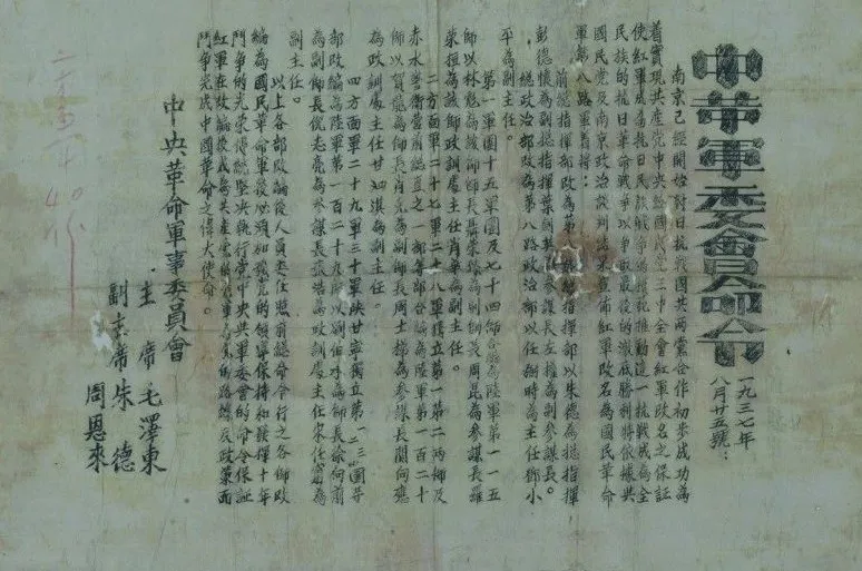 就在這一天,經過艱苦的談判終於達成協議,蔣介石基本同意了中共中央最後提出的十條。同意紅軍改編為國民革命軍八路軍,任命朱德、彭德懷為正副總指揮,下轄第一一五師、一二О師、一二九師3個師,劃歸閻錫山第二戰區序列。9月22日,國民黨中央通訊社公佈《中共中央為公佈國共合作宣言》,蔣介石同時發表談話,事實上承認中國共產黨的合法地位。