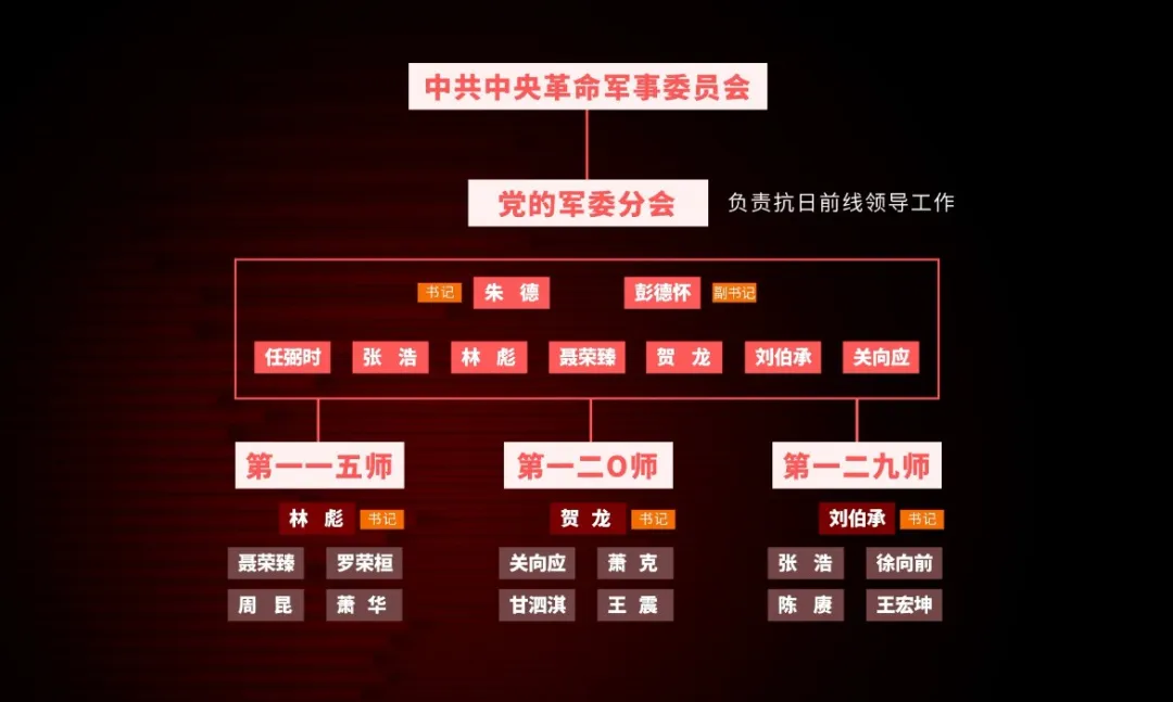 1937年8月29日,在主力開赴抗戰前線情況下,中央決定前方設黨的軍委分會,以朱德、彭德懷、任弼時、張浩、林彪、聶榮臻、賀龍、劉伯承、關嚮應等9人組成,以朱德為書記、彭德懷為副書記,負責八路軍出師抗日前線後的領導工作,受中央軍委會統轄。各師成立軍政委員會,第一一五師是林彪、聶榮臻、羅榮桓、周昆、蕭華,以林彪為書記;第一二О師是賀龍、關嚮應、蕭克、甘泗淇、王震,以賀龍為書記;第一二九師是劉伯承、張浩、徐向前、陳賡、王宏坤,以劉伯承為書記。各師軍政委員會均受軍委分會統轄。[22]