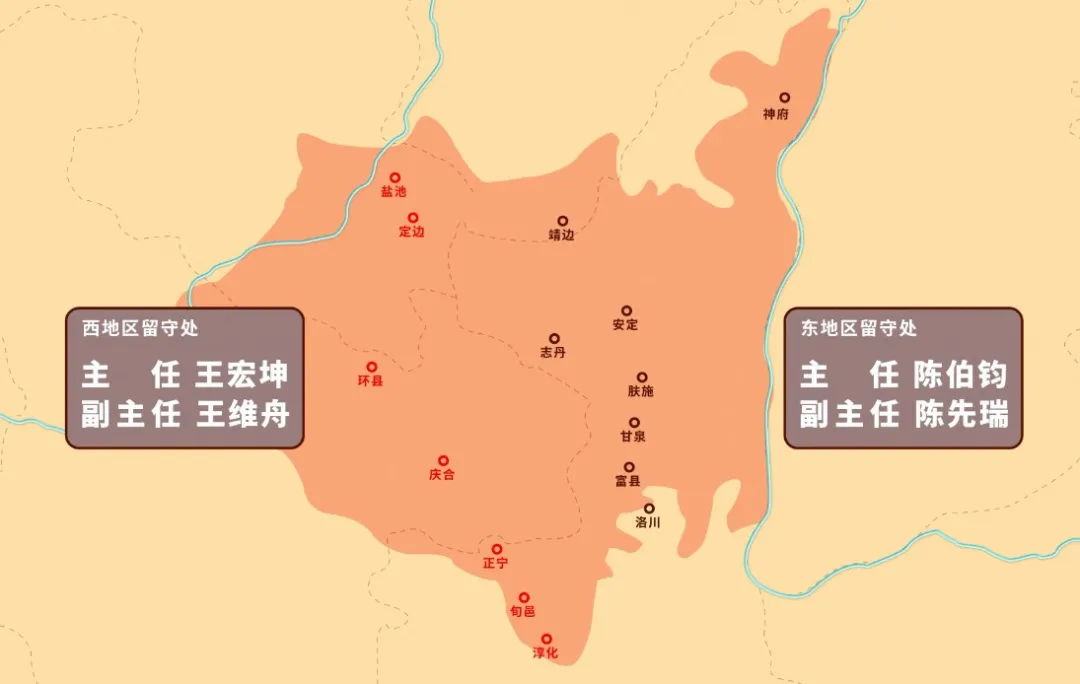 整個陝甘寧邊區劃分為東西兩個部分。以神府、靖邊、安定、志丹、膚施、甘泉、富縣、洛川等縣為東地區,留守處以陳伯鈞為主任,陳先瑞為副主任;以定邊、鹽池、環縣、慶合、正寧、淳化、旬邑等縣為西地區,留守處以王宏坤為主任,王維舟為副主任。