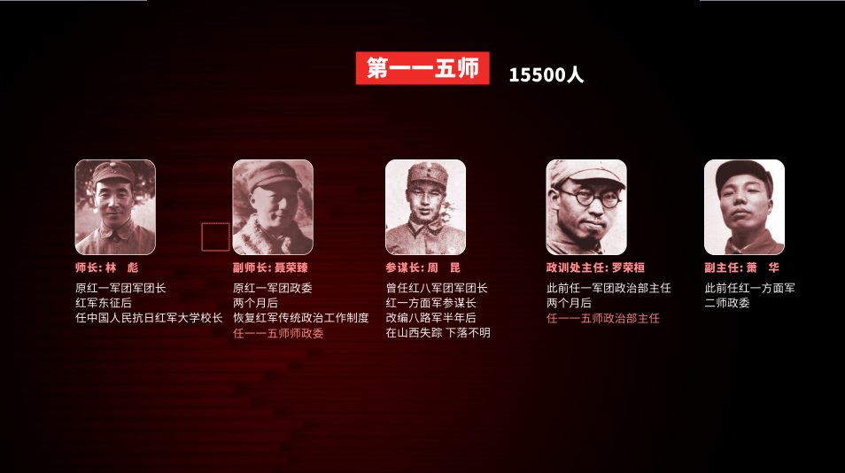 師長林彪(原紅一軍團軍團長,紅軍東征後任中國人民抗日紅軍大學校長),副師長聶榮臻(原紅一軍團政委,兩個月後恢復紅軍傳統政治工作制度任一一五師師政委),參謀長周昆(曾任紅八軍團軍團長、紅一方面軍參謀長,改編八路軍半年後在山西攜款失蹤,下落不明),政訓處主任羅榮桓(此前任一軍團政治部主任,兩個月後任一一五師政治部主任),副主任蕭華(此前任紅一方面軍二師政委)。
