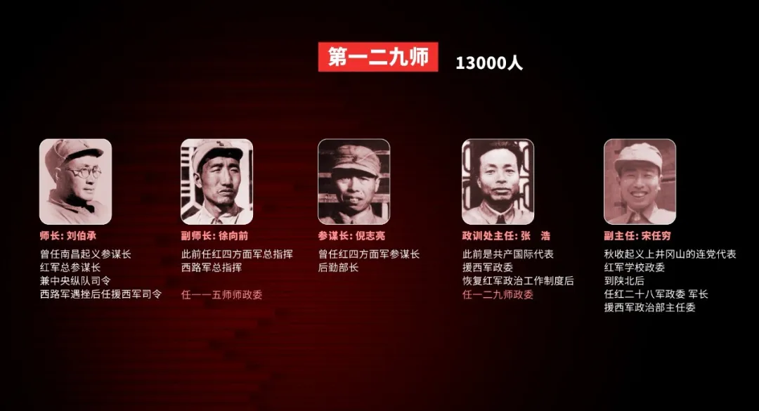 師長劉伯承(曾任南昌起義參謀長,紅軍總參謀長兼中央縱隊司令,西路軍遇挫後任援西軍司令),副師長徐向前(此前任紅四方面軍總指揮,西路軍總指揮),參謀長倪志亮(曾任紅四方面軍參謀長、後勤部部長),政訓處主任張浩(此前是共產國際代表,援西軍政委,恢復紅軍政治工作制度後任一二九師政委),副主任宋任窮(秋收起義上井岡山的連黨代表,紅軍學校政委,到陝北後任紅二十八軍政委、軍長,援西軍政治部主任)