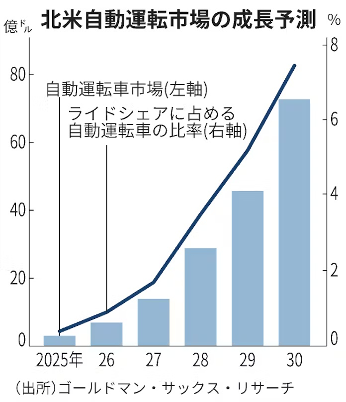 根據美國高盛研究公司(Goldman Sachs Research)預測,北美自動駕駛市場到2030年將增至2025年的20倍,達到約73億美元。8%的網約車市場將採用自動駕駛汽車。