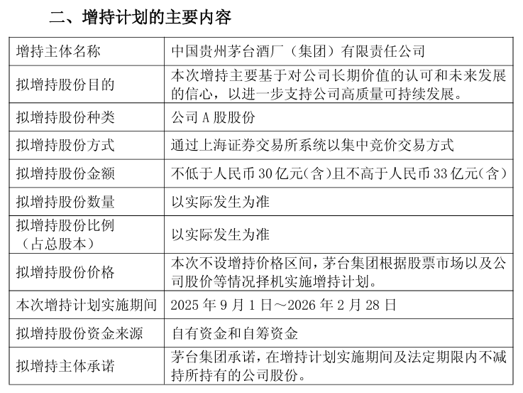 對於本次增持,貴州茅台表示,主要基於對公司長期價值的認可和未來發展的信心,以進一步支持公司高質量可持續發展。本次不設增持價格區間,茅台集團將根據股票市場以及公司股價等情況擇機實施增持計劃,且承諾在增持計劃實施期間及法定期限內不減持所持有的公司股份。