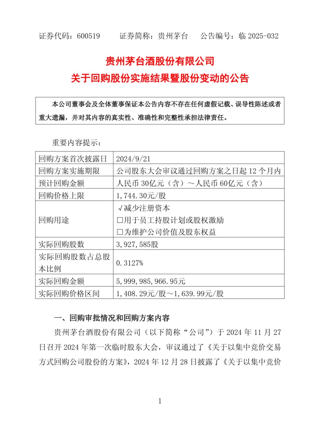 8月29日,貴州茅台酒股份有限公司(股票代碼:600519.SH)公告稱,自2025年1月2日首次回購以來,公司8個月已完成回購股份,實際回購股數為392.76萬股,佔總股本的0.3127%,回購價格區間為1408.29元/股—1639.99元/股,使用資金總額60億元。