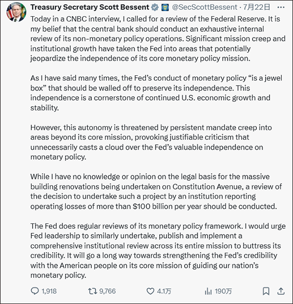 財長貝森特也加入了攻擊陣營。7月21日,他在CNBC採訪中要求對美聯儲進行審查,聲稱央行存在"持續的使命蠕變,涉足核心使命之外的領域”。