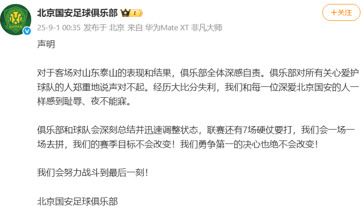 9月1日凌晨,@北京國安足球俱樂部 發佈道歉聲明: