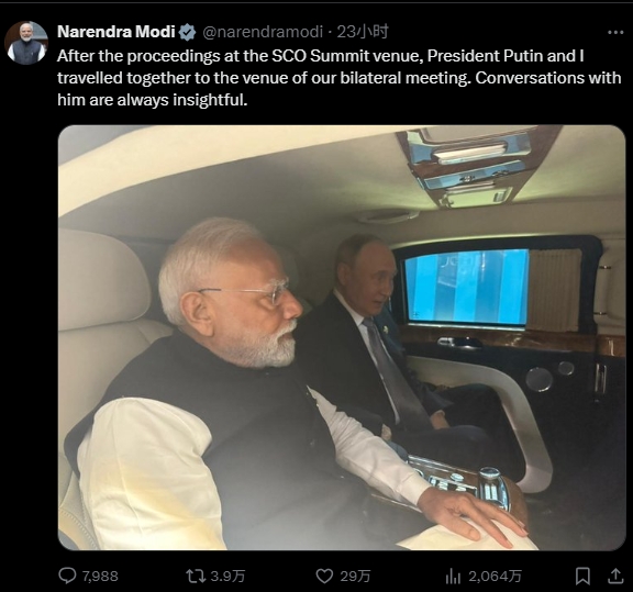 1日會晤前,印俄領導人同乘一輛車,一對一交談了近一小時 推文截圖