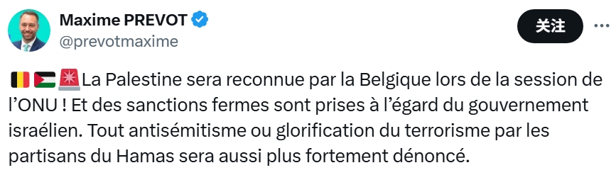 普雷沃在貼文中表示:“比利時將在聯合國會議上承認巴勒斯坦!以色列政府也將受到嚴厲制裁。”不過與此同時,他也表示“哈馬斯支持者的任何反猶太主義或美化恐怖主義的行為也將受到更強烈的譴責”。