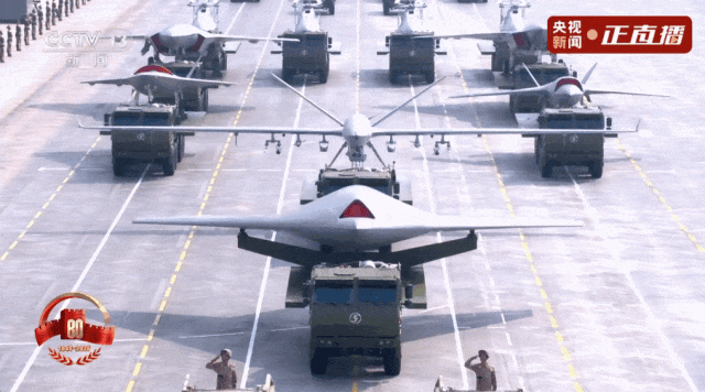 空中無人作戰方隊接受檢閲。受閲的新型察打一體無人機、無人僚機、艦載無人直升機,可隱蔽突擊、廣域覆蓋、自主協同。