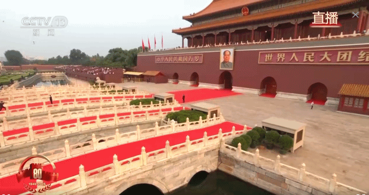 紅毯覆橋儀仗肅立,這裏的每一處細節都彰顯着紀念大會的莊嚴與隆重。旭日東昇,在朝陽的照射下,此刻的金水橋金輝盪漾,更加充滿了儀式感。