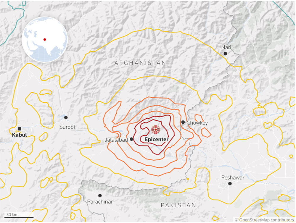 31日凌晨發生的地震發生在阿富汗賈拉拉巴德東北27公里處,震源深度約為8千米。賈拉拉巴德是阿富汗楠格哈爾省一座約有20萬人口的繁華城市,位於巴基斯坦邊境附近的山區,以地震活動活躍而聞名。