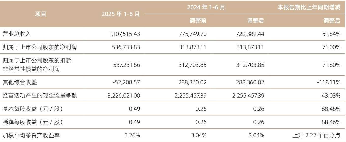 國信證券2025年半年報顯示,上半年公司合併口徑實現營業收入110.75億元,同比上升51.84%;歸屬於上市公司股東的淨利潤53.67億元,同比上升71%。其營收排名從去年同期的第十二位躍升至第八位,大幅提升4位,營收同比增加33.18億元,進步顯著。在行業整體回暖中,其淨利潤行業排名第六,同比增速高於行業平均水平,表現亮眼。
