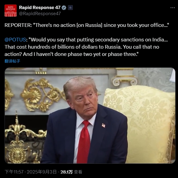 被質疑對俄沒行動,特朗普反駁:我制裁印度了,這叫沒行動?